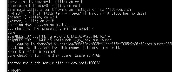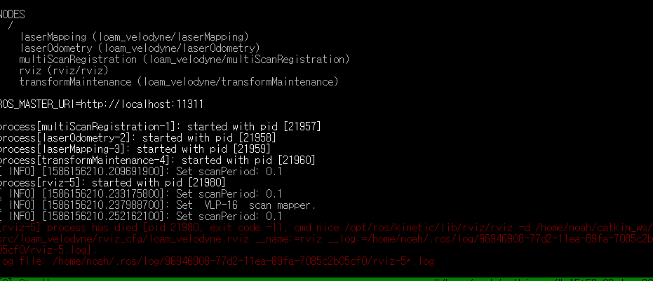 Ask questionsloam_velodyne failed I have built the loam project successfully.And when I launch in ros kinetic ,it's successful too. But when I play the bag it's error in my computer.such as: ... logging to /home/lmt/.ros/log/d9401fc2-77a2-11e8-a910-902b343